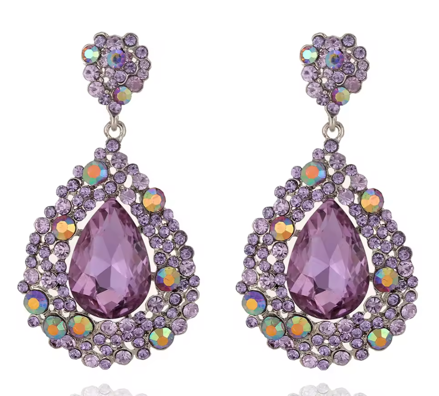 Handcrafted AB crystal earrings made with Austrian crystals and a Zinc Alloy metal base. Each set is made to order and can come in almost any color.