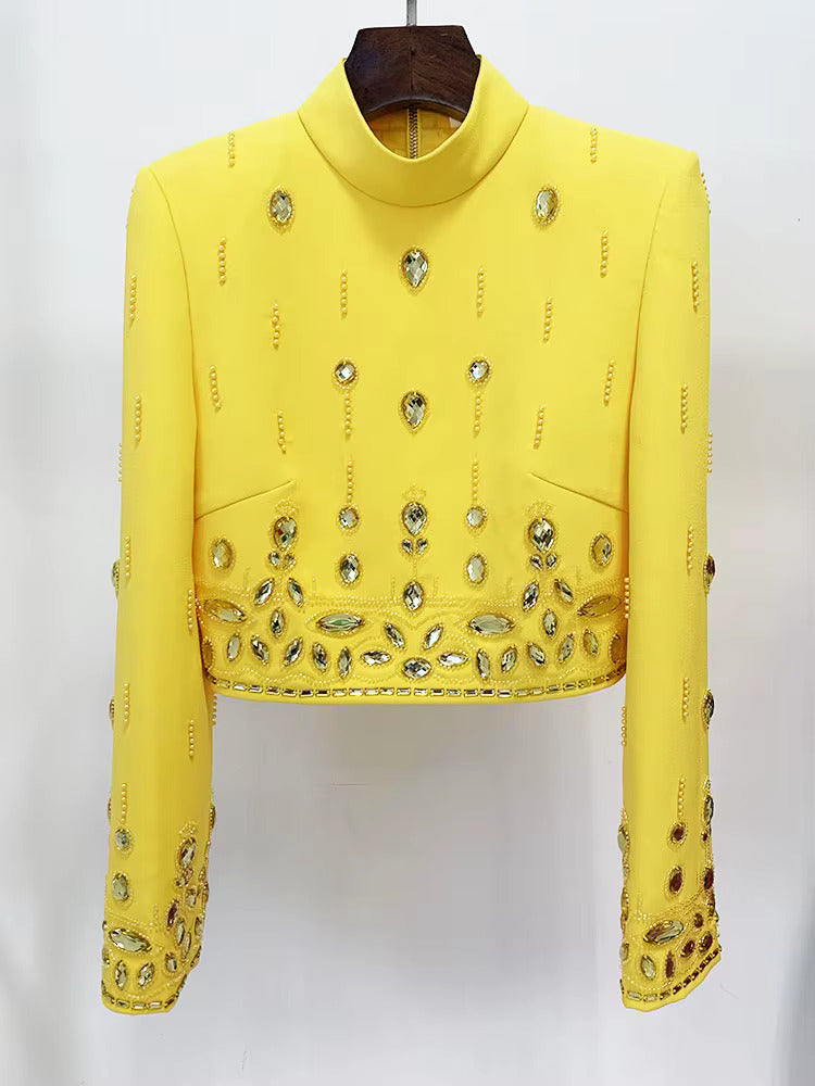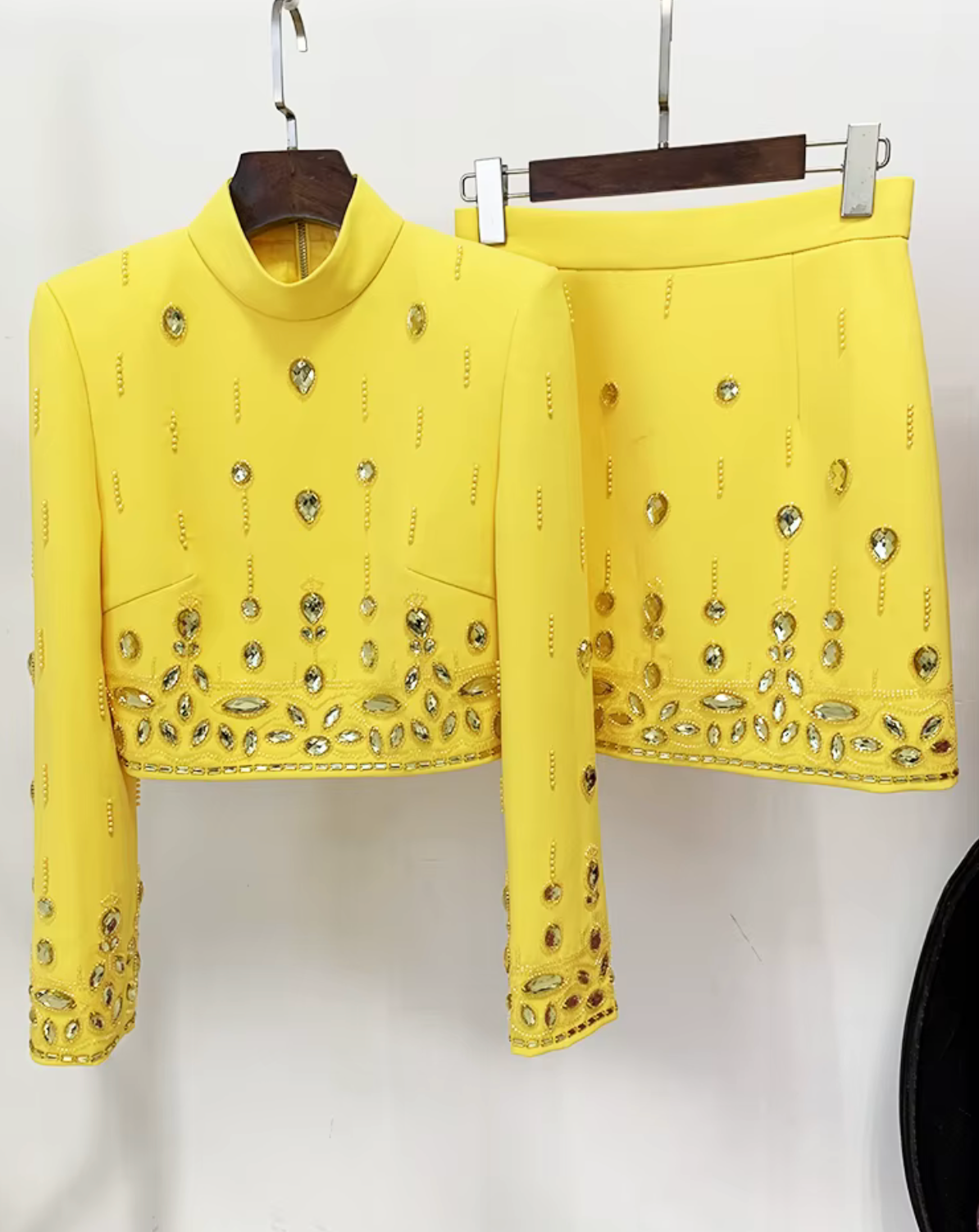 Bead Embellished, stylish two-piece outfit consisting of a high-neck cropped top and a matching mini skirt, available in four different colors: yellow, light blue, white, and black.
