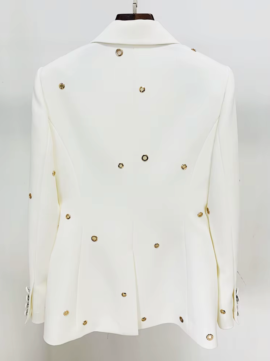 A stylish tailored pantsuit adorned with metallic grommet eyelet details distributed across the blazer and trousers, adding a modern and edgy aesthetic. The fitted blazer features a single-button closure, a structured lapel, and flap pockets. The matching high-waisted pants are fitted through the thighs and flare slightly at the bottom, creating an elongating silhouette. Available in four colors, Red, Blue, White, and Black.